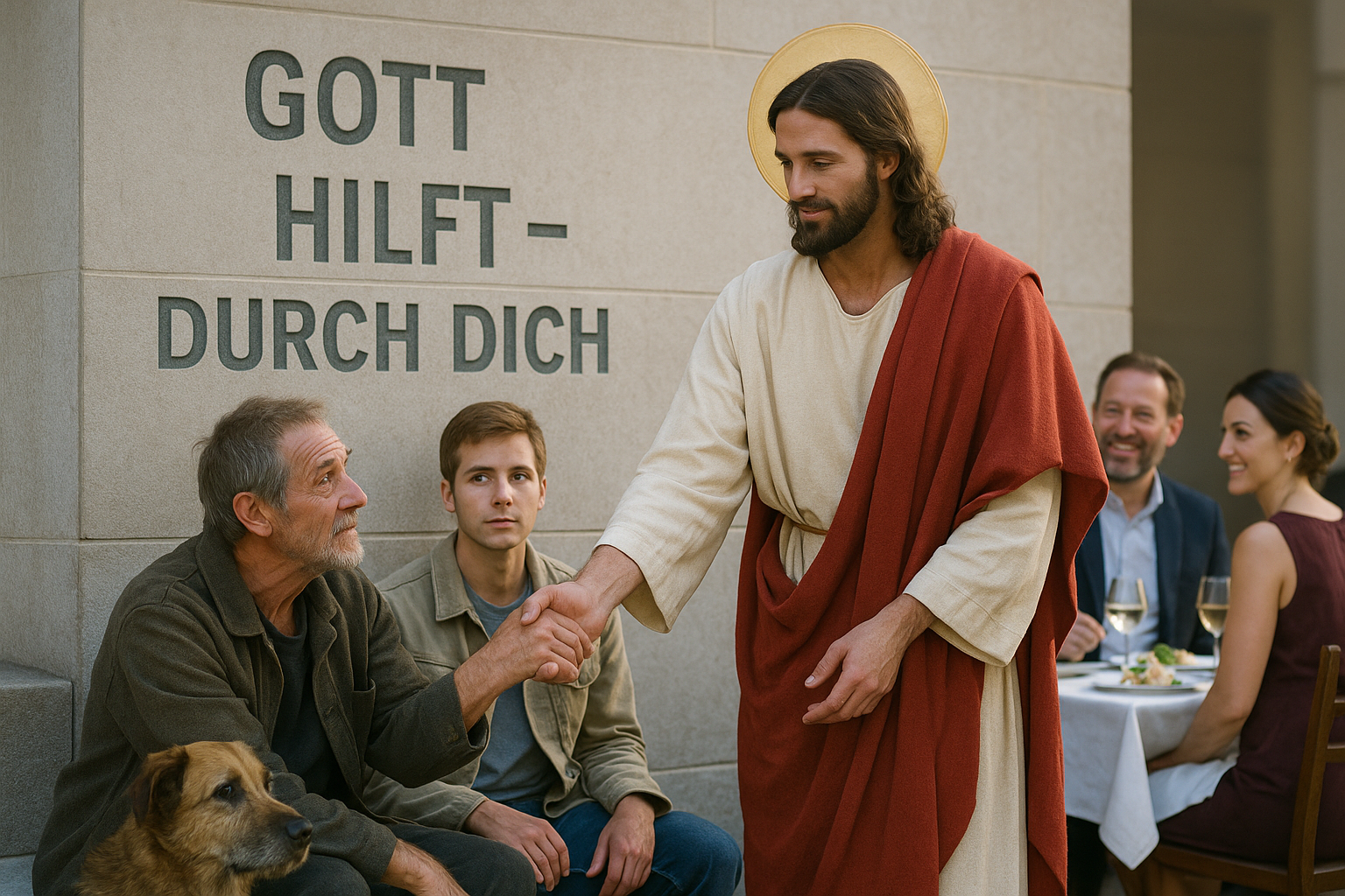 „Habt ihr eigentlich bemerkt, kurz vor der Trauerfeier für unsern Bruder fand noch eine andere Beerdigung statt? Eine armselige Sache; nur der Pfarrer und die Friedhofsangestellten gingen mit dem Sarg, sonst niemand.“ „An der Totentafel stand etwas von einem gewissen Lazarus.“ „Lazarus,– war das nicht der Bettler, der immer vor der Haustür unseres Bruders herumlungerte?“ „Ja, natürlich, dieser zerlumpte Kerl. Sein Gesicht war ganz vernarbt und eitrige Beulen hatte er an seinen Händen. Eigentlich hätte er ins Krankenhaus gehört.“ „Nein, den nimmt kein Arzt auf; der war nicht privatversichert!“ „Wovon lebte er wohl?“ „Keine Ahnung. Vielleicht von leeren Pfandflaschen aus den Abfalleimern. In den Mülltonnen unseres Bruders hat er auch immer wieder nach essbaren Resten gesucht, bis dieser es ihm untersagte. Containern verboten, sagte er.“ „Recht hatte er. Wenn du solchen Leuten hilfst, lockst du nur noch weitere an. Das ist so ein Pull-Effekt: Morgen sind es dann zwei, übermorgen schon vier, dann acht und bald werden wir alle von diesen Leuten überschwemmt.“ „Man darf die Faulheit von solchen Sozialschmarotzern nicht noch unterstützen. Uns wurde doch auch nichts geschenkt. Nur, wer etwa leistet, kann sich auch etwas leisten.“ „Lazarus – wie kann so einer nur Lazarus heißen. Ich erinnere mich, der Name bedeutet: Gott hilft. Von Gottes Hilfe hat er aber nichts gespürt. Nur die Gassenköter schienen Mitleid mit ihm zu haben, wie sie um ihn herumstrolchten und seine Wunden leckten, so wie sie es sonst mit ihresgleichen tun.“ „Das Beste, was ihm passieren konnte, ist, dass er nun tot ist.“